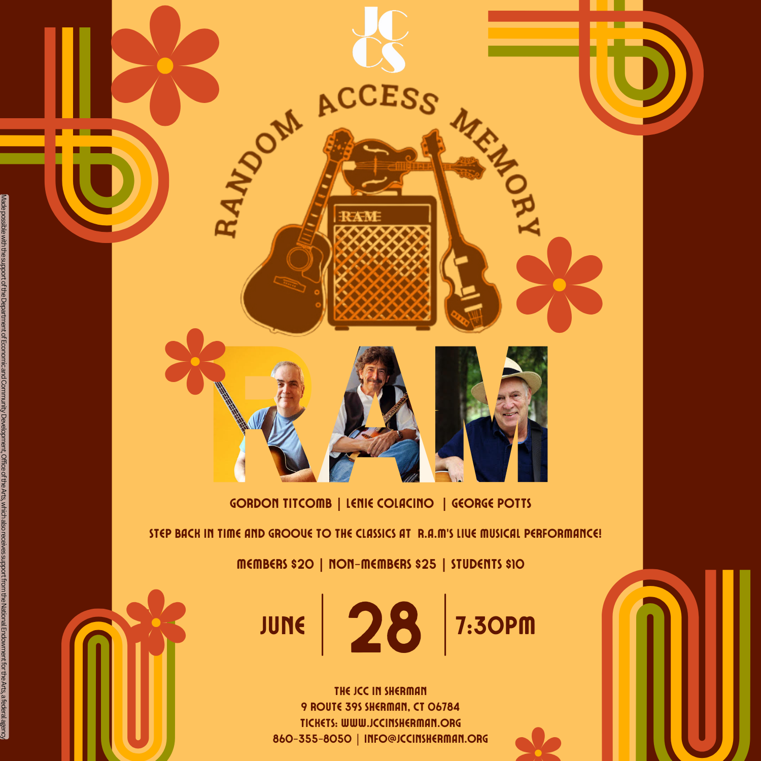 Join R.A.M at the JCC on June 28th for a jammin’ good time! This trio has been together for more than 5 years, singing and playing songs from the 1960’s and 1970’s. Its time to listen to some feel good music and be with friends! ----------------- Band Members: George Potts (Guitar & Vocals), has been a […]