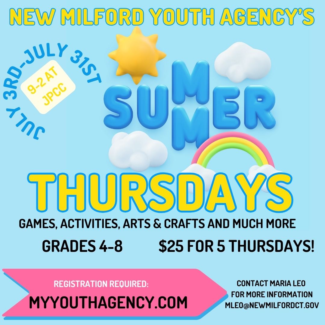 New Milford Youth Agency's "Summer" Thursdays! Games, activities, Arts and Crafts and much more! Grades 4 - 8 9-2pm at New Milford Youth Agency / JPCC $25 for 5 Thursdays Rgistration required - myyouthagency.com Contact Maria Leo for more information - mleo@newmilfordct.gov