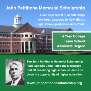 The John Pettibone Memorial Scholarship Fund was established in 1949 in memory of John Pettibone, who for 42 years developed, guided, and inspired the New Milford public schools. At one time, Mr. Pettibone supervised two dozen one-room schoolhouses in our area.
